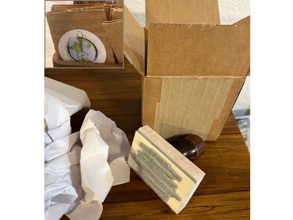 We will turn shipping boxes into business cards, and stamp them with our wooden stamp and plant-based ink pad.